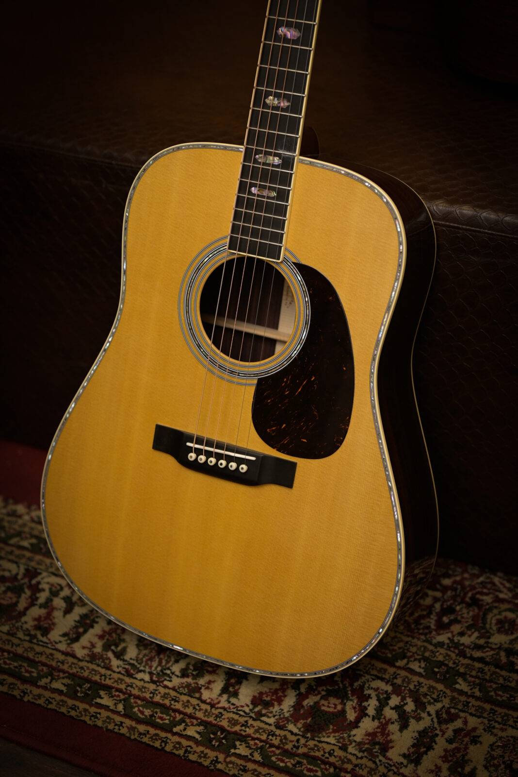 De Martin D-41 combineert de krachtige Dreadnought-klank met elegante abalone inleg op een spruce bovenblad en East Indian Rosewood zij en achterkant. Het is een verfijnde, ruimtevullende akoestische gitaar, ontworpen voor spelers die een krachtig geluid met precies de juiste hoeveelheid glans willen.